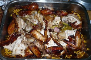 Let’s start with Asian continent! I saw my Philippino friend, NR, was preparing roasted chicken. He stuffed the chicken with sweet corn, garlic, onion, green paprika and seasoned it with fish sauce, olive oil and salt. When the chicken was well roasted and taken out from the oven he then cut the chicken into pieces. If you see the photo you can hardly see that it’s roasted chicken but trust me, the taste was incredibly delicious!