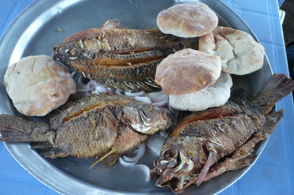 Lunch of the day: Tilapia fish, bread, onions, and lemons